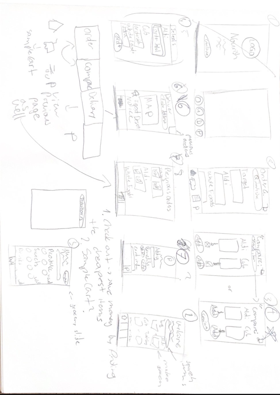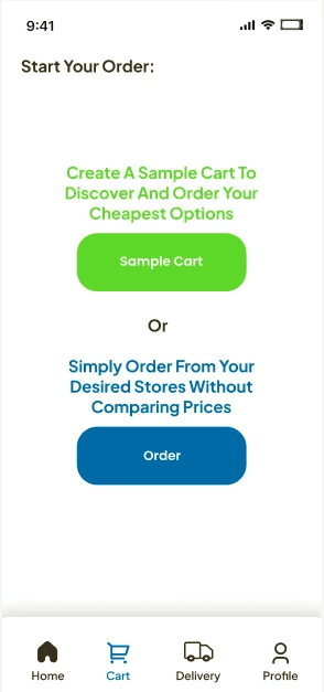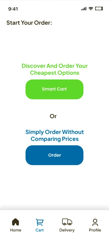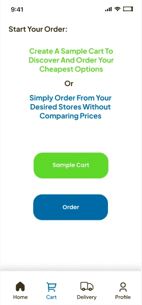 The app design enables side-by-side price comparisons across multiple grocery stores, highlights the most affordable options, and integrates a delivery service to reach users with limited physical access to food. Clear interface hierarchy and approachable visual language were used to keep cost transparency easy to understand and actionable.