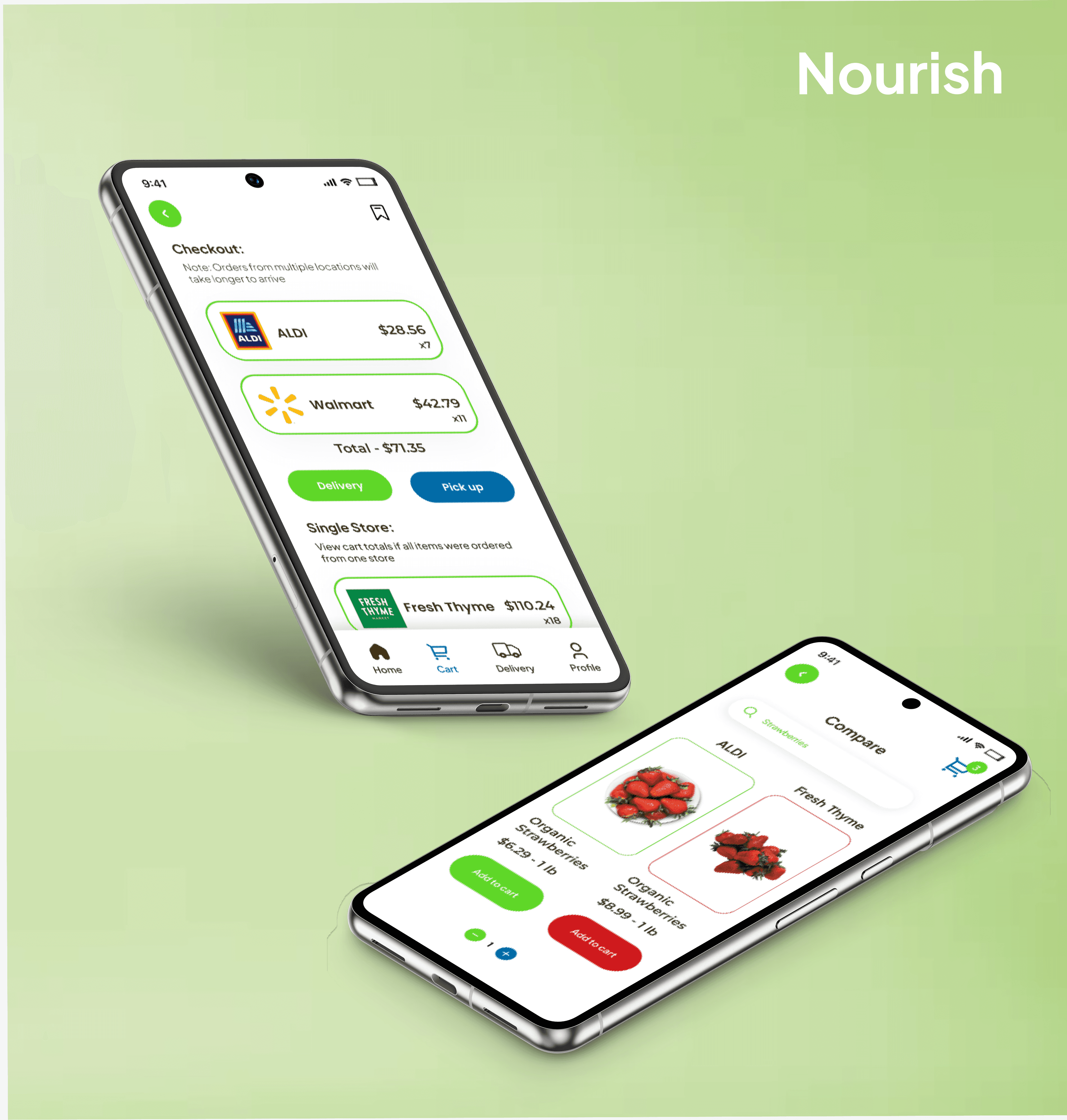 Nourish was designed as a response to rising grocery costs and limited access in food deserts, aiming to reframe affordability and convenience as essential services rather than privileges.